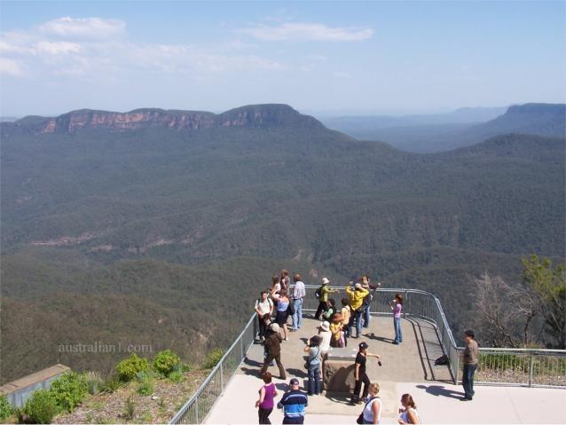 This is a public observation platform at Echo Point in the Blue Mountains National Park. The photo shows magnificent views of the Jamison Valley. The tourist information centre is located here. To the right out of sight in the distance is the Sceniscender Cable Car and the Katoomba Scenic Railway. To the left out of sight are the Three Sisters Rock formation.