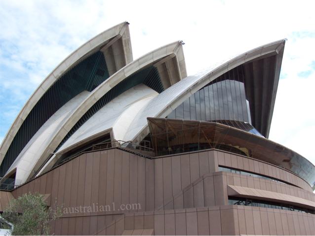 This is a photograph of the Sydney Opera House from the harbour side. It shows the right wing from the harbour.